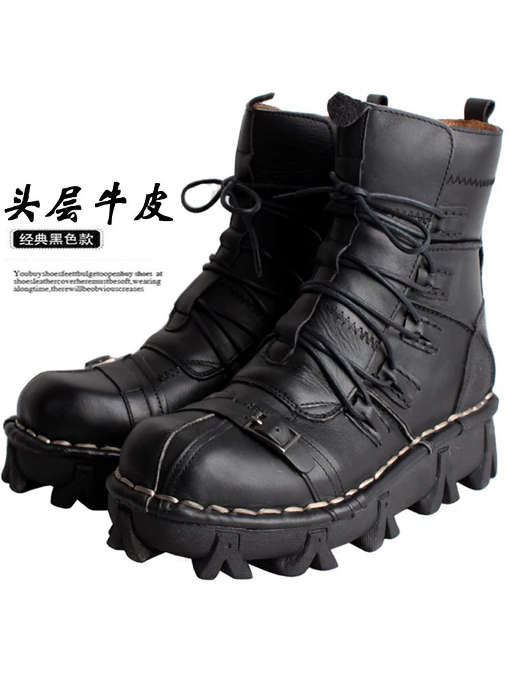 Trend Men's Cowhide Genuine Leather Motorcycle Boots Military Combat Boots Desert Ankle Boots Gothic Skull Punk Boots Martin Boots