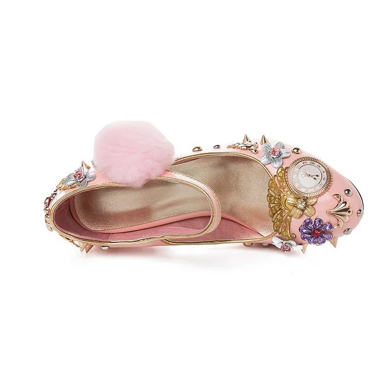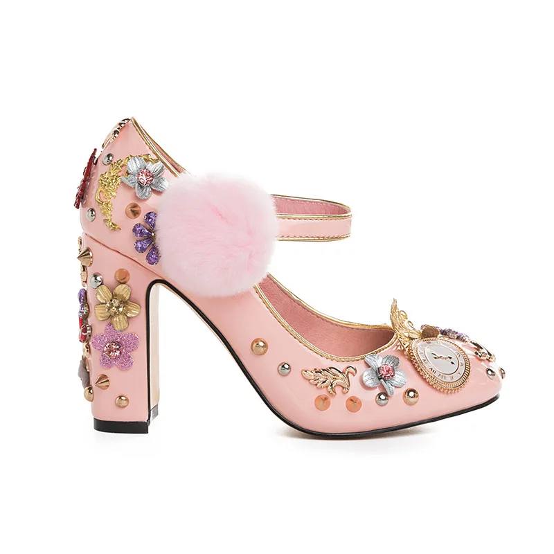 Big Sale Phoentin pink mary janes crystal flower women pumps with fur genuine leather ladies party shoes clo
